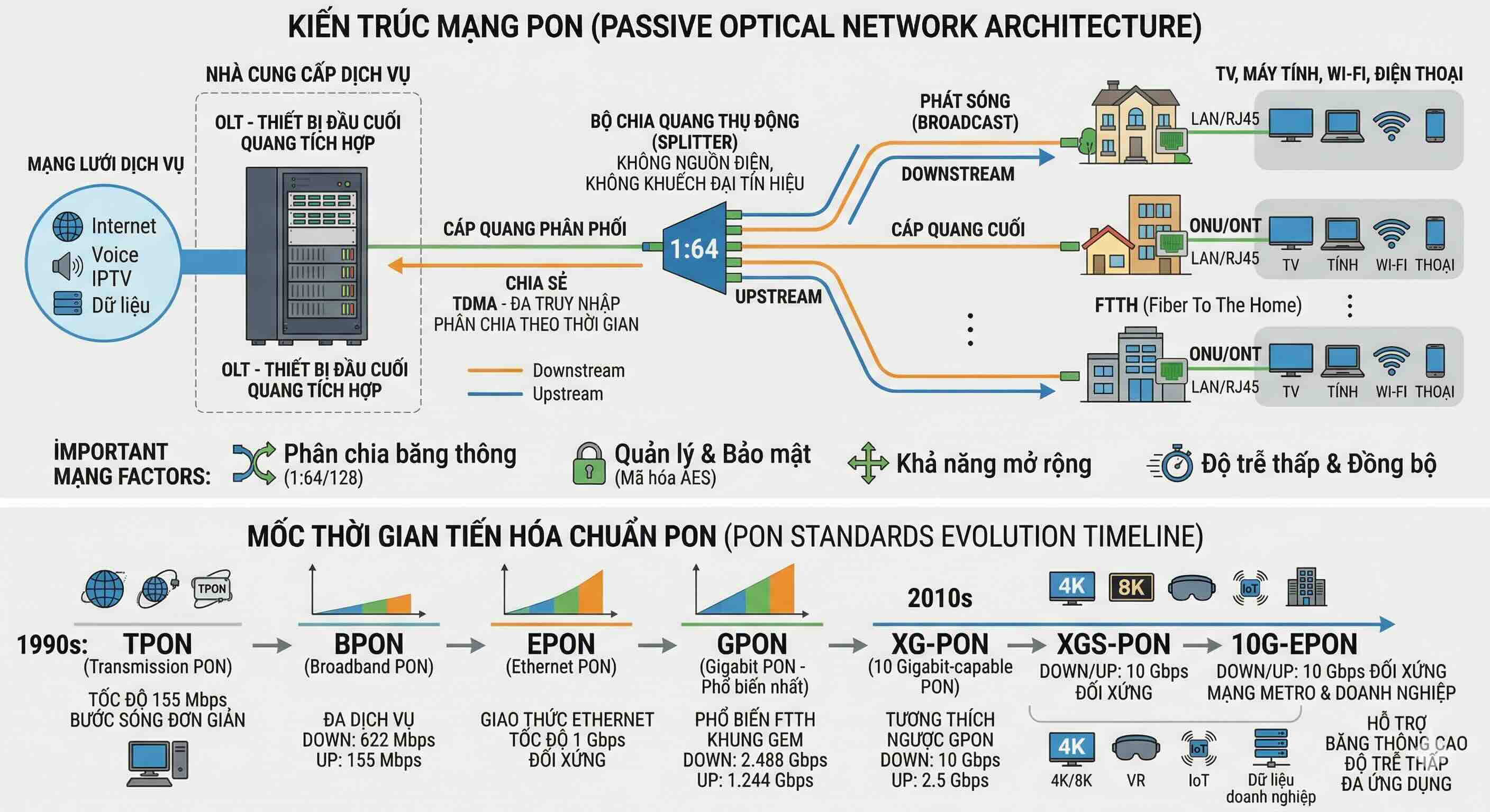 - Quản lý và bảo mật: Các chuẩn PON tích hợp các cơ chế mã hóa AES, xác thực và quản lý truy cập để đảm bảo an toàn dữ liệu và ngăn chặn truy cập trái phép.