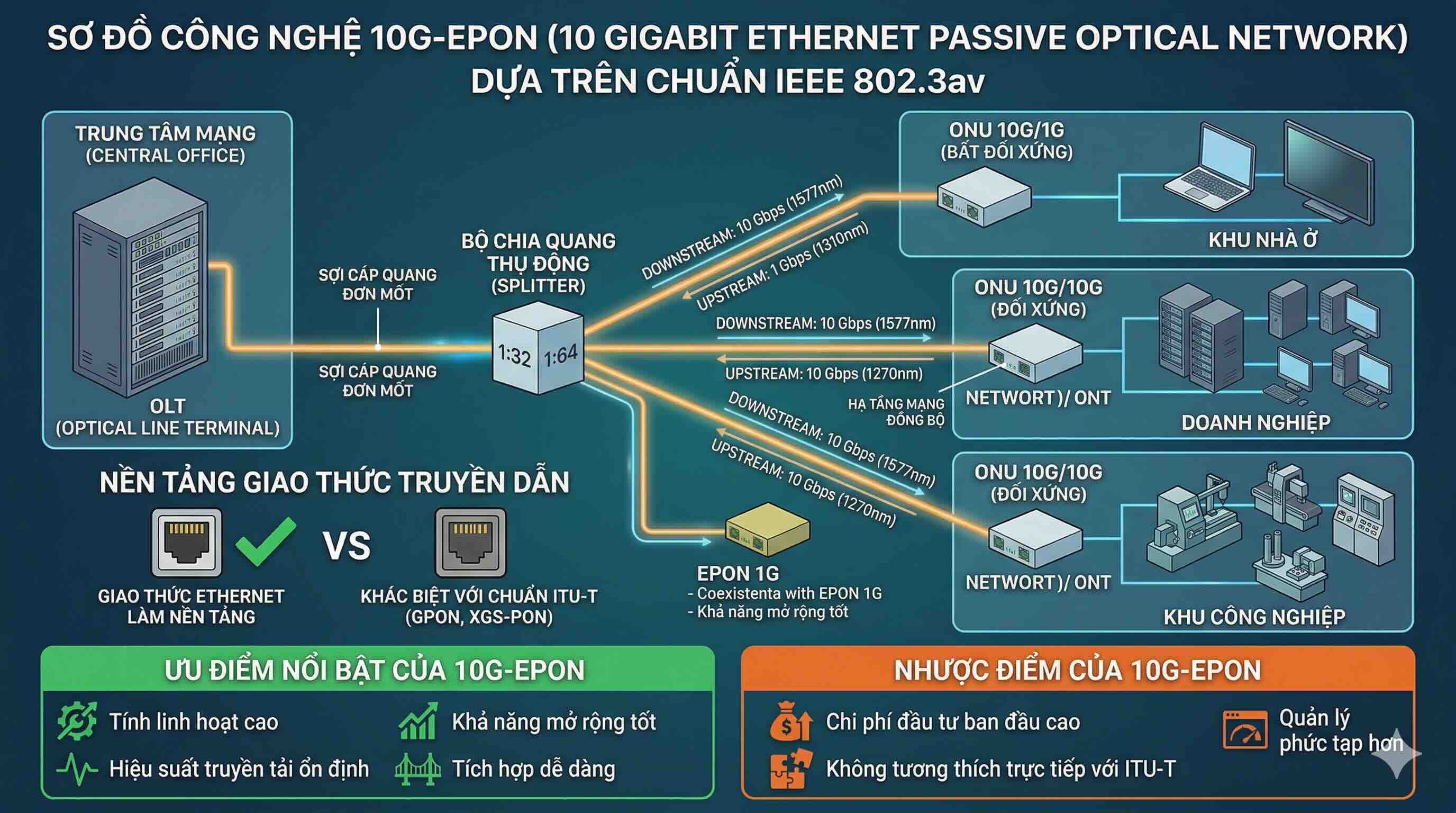 Ưu điểm của 10G-EPON là hiệu suất cao, linh hoạt trong việc cấu hình băng thông và tối ưu cho các ứng dụng doanh nghiệp lớn, khu công nghiệp và mạng Ethernet. Tuy nhiên, nếu không có hạ tầng EPON trước đó, việc triển khai 10G-EPON đòi hỏi xây dựng hạ tầng riêng biệt, làm tăng chi phí và độ phức tạp.